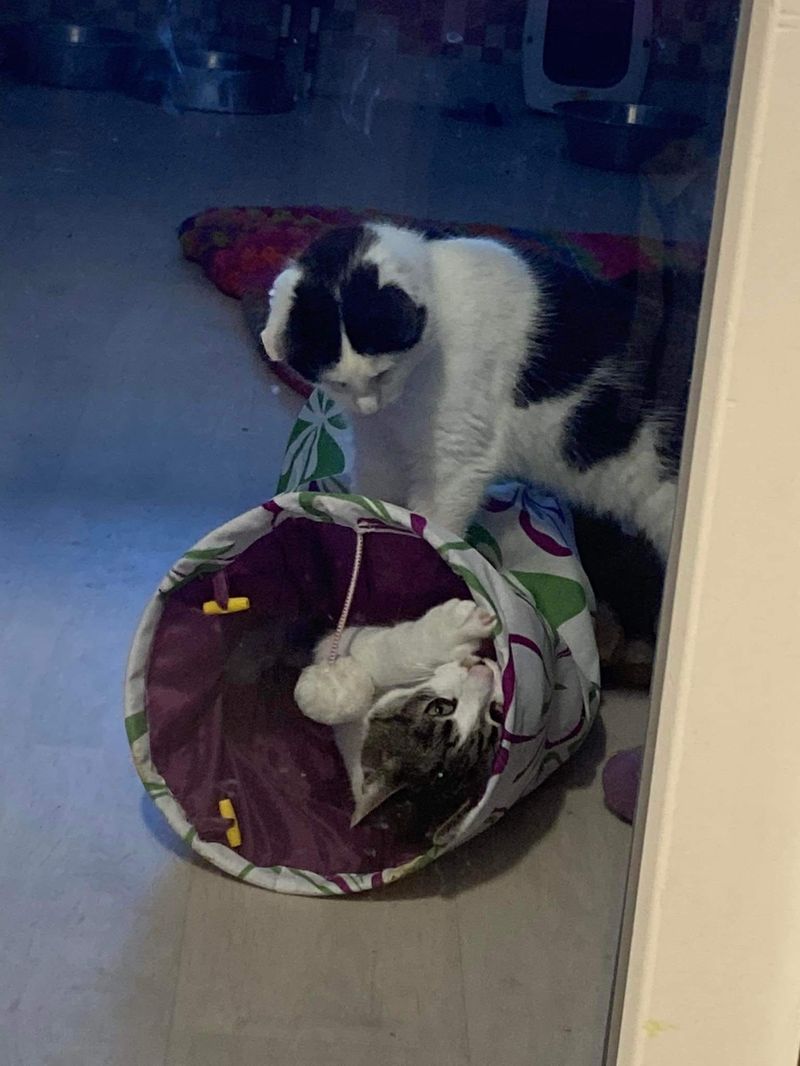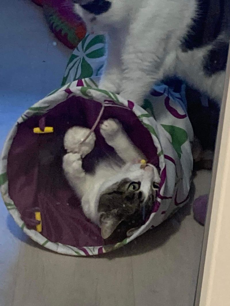 Jaunutis, vos dviejų metų amžiaus katinėlis…Tokių įprastų spalvų ir raštų mūsų akims fainuolis.Čia nuotraukose užfiksuoti vaizdai, kai kačių kambarėlyje užeina „siutas” ir tada visai nesvarbu kokio amžiaus katės ten gyvena, siaučia visos iki vienos. Tame tarpe ir Lapelis.Nuotraukose Lapelis „tunelyje” įsisitaisęs”, o kambariokas, bando jį iš to „tunelio” išgyvendint. Čia žinoma, tik maža dalis to jų gyvenimo akimirkų…Jeigu ateitumėt, galbūt, dar ne tokių vaizdų pamatytumėt… Lapelis su žmogumi yra ne toks drąsus. Jis baliukas. Ne veltui juk Lapelis. Juk lapeliai, kurie auga ant medžių, juda ir blaškosi dėl kiekvieno lengvo vėjo gūsio. Mūsų katinelis panašiai elgiasi. Kartais išsigąsta ir bėga slėptis, tada visus stebi iš šalies, ne dalyvaudamas tiesioginiame kontakte su žmogumi…Bet čia laikina. Tokie bailiukai atsiskleidžia tik namuose. Ten kur įpranta būti prie žmogaus, kur nusistovėjęs režimas, kvapai, garsai ir visa kita. Tas ramumas, pastovumas, kates ramina, atpalaiduoja ir jos pražysta ir išskysta nuo visos aplinkos, nuo paglostymu ir dėmesio.Viso to reikia ir Lapeliui. Nereikia bijoti tų bailiuku. Juos reikia imti ir įrodyti, kad ju baimė žmogui visai nepagrįsta ir kad visai be reikalo bijojo….Ar bus norinčių įrodyti ir parodyti visai kita pasaulį mūsų Lapeliui?Tik gyvenimui greta žmogaus, namuose ir draugystei ir meilei .